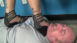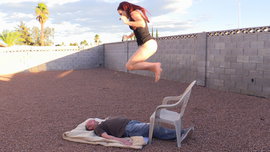 Apr 1 - Jolene is bored so after her slave worships her bare feet she decides to stretch her legs a bit, but on top of him. She makes him lie down and tramples and stomps on his chest and balls with her bare feet.