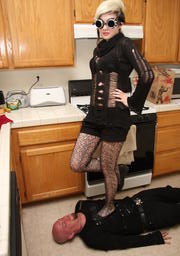 Jun 29 - Bubblegum decides to tenderize her trample slave before dinner. She is wearing stockings and flat black shoes. She is making sexy poses for the camera and ignoring the squirming of the slave under her feet.