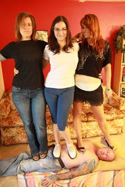 May 3 - It\'s trample time!!! Mistress Eve has another one of her unique get togethers with her lady friends, but instead of coffee and tea or drinks she has served up her foot slave to them for their trampling pleasure.