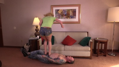 Apr 14 - Trampling workout. Britney works up a sweat while jumping up and down and ladiesfloor and using his belly as a trampoline.