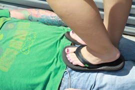 Mar 22 - Mistress Kat tramples ladiesfloor again, stepping on his chest face and neck with her flip flops