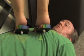Mar 4 - Video clip: Mistress Kat is wearing her specially made flip-flops with sharp METAL STUDS, while trampling ladiesfloor