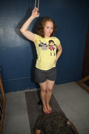 Oct 9 - Miss Crash puts her human floors head right under her dirty heels with and without shoes. She treats him like the garbage he his by stomping all over him.