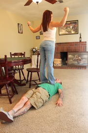 Sep 14 - Mistress Ashley balances on a guy's head and then proceeds to step up and down his body like he is a rug under her feet. She also steps on his hand and grinds it under the sole of her foot