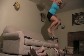 Sep 11 - Video clip on Mistress Nicole jumping from a couch and landing her full weight on his chest and stomach again and again. She is laughing out loud and obviously having a lot of fun while he squirms in pain