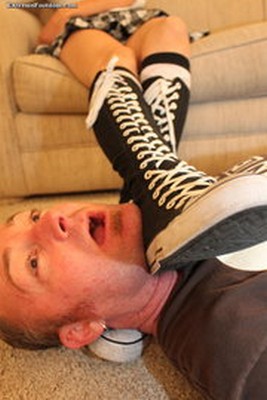 Aug 17 - Mistress Trinity humiliates ladies floor by ordering him to crawl on the floor to her feet, steps all over his face and then makes him lick her knee high tennis shoes.